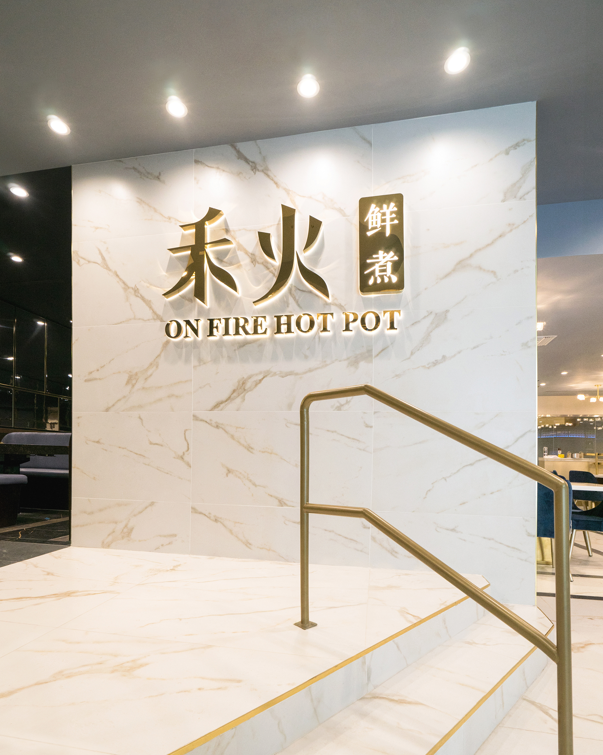 On Fire Hot pot is a remodel of a 4,000 square foot old barbecue into a luxury dining venue. Carrara marble, brushed brass, blue velvet, the overall material palette works altogether to create this art deco style of interior space. By balancing the material in fine lines and slim trim, the space is elevated into an elegant and picture-perfect spot.