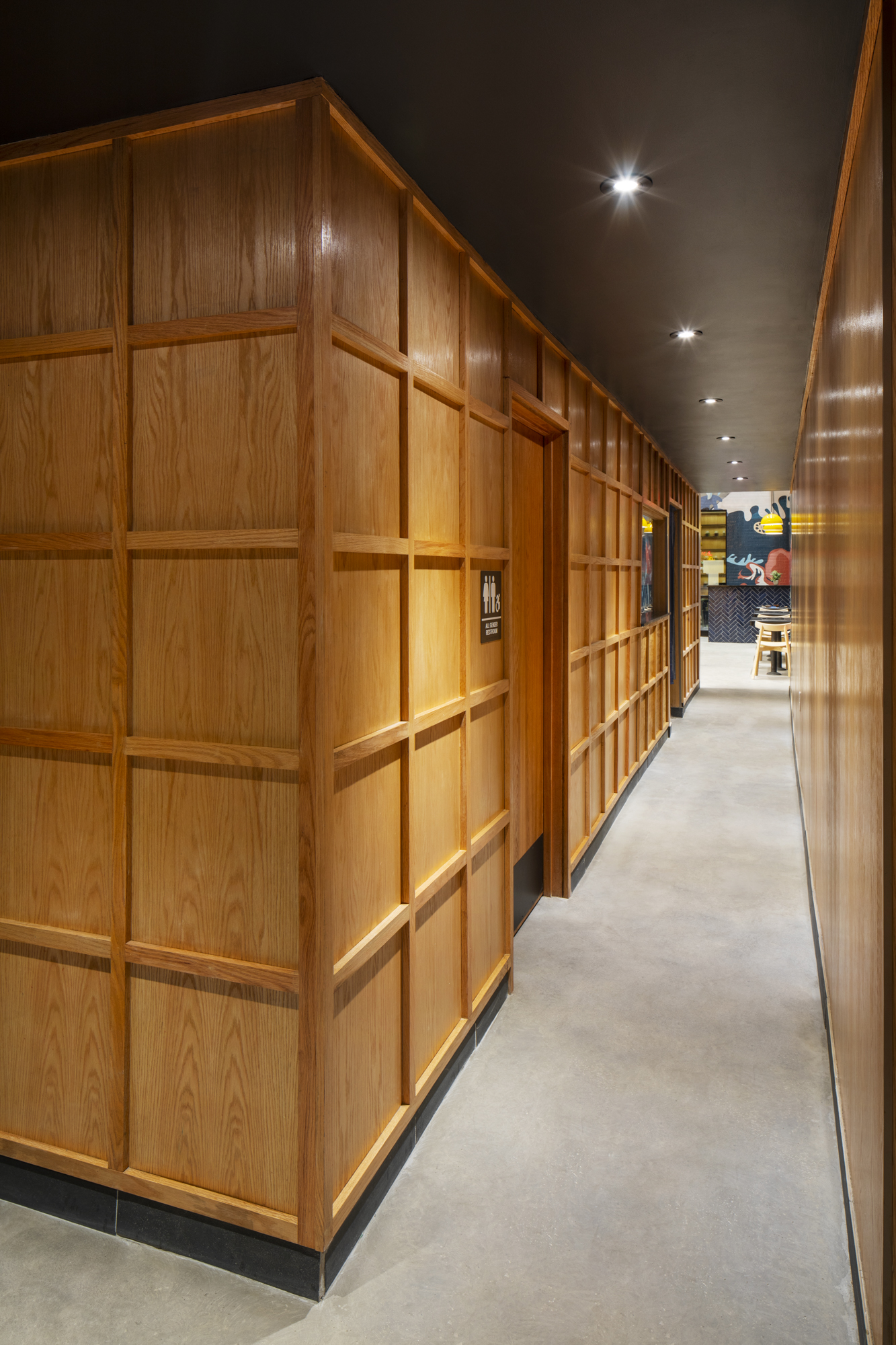 Uncle Lee’s Kitchen is located in a narrow, tall, and deep store. We separate the long space into two parts with a giant wooden box. Outside the box is the opened ocean dining area, and inside the box is the service core with a more intimate dining area upstairs.