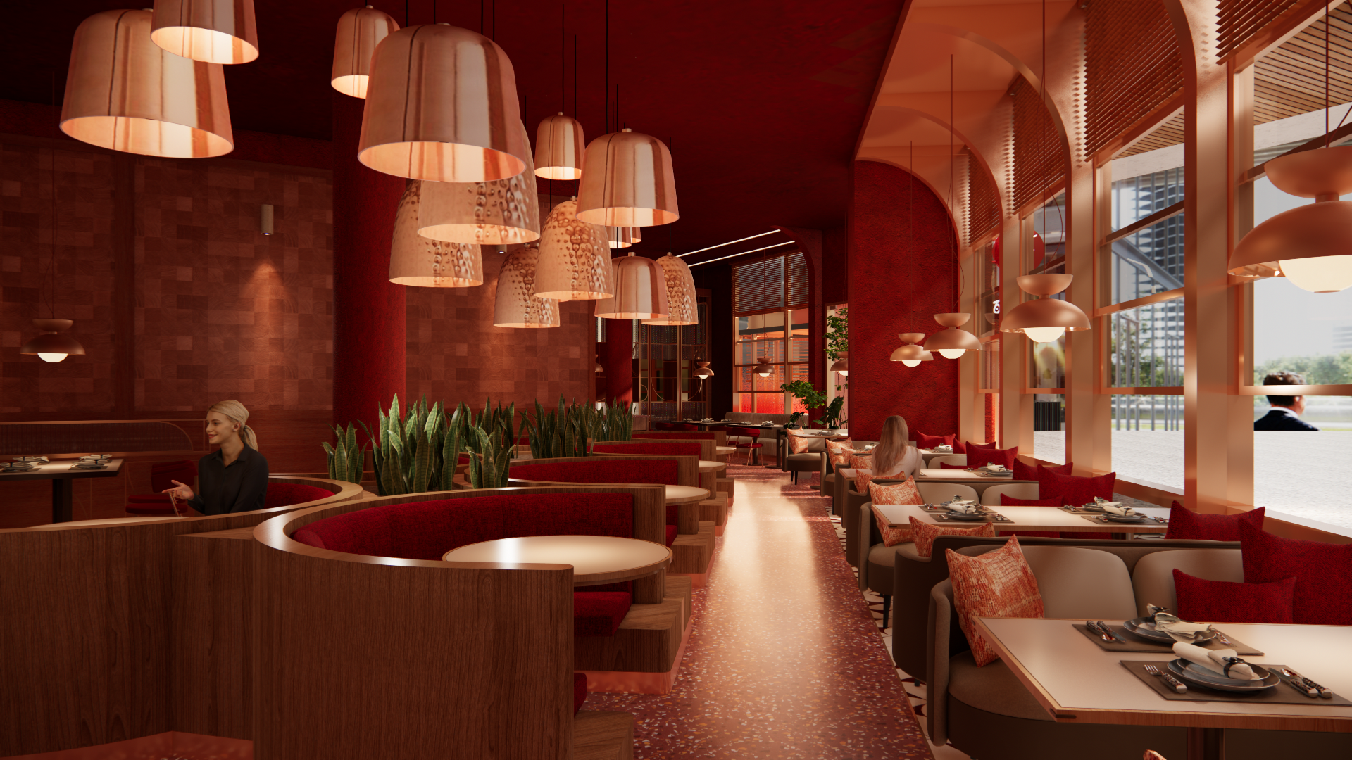 The seating layout progresses through four zones, beginning with a lounge near a slide-up window for relaxed dining. Semi-circle booths with integrated greenery create a filtered transition away from the exterior noise, leading to a large, rounded booth across from the bar that emphasizes openness by omitting pendant lighting. The final layer features a linear booth facing a geometric, copper-tinted mirror, perfect for flexible, smaller gatherings. For exclusive events, the VIP room includes six pivoting screens, allowing it to adapt from an open space to a private, intimate setting with ease.